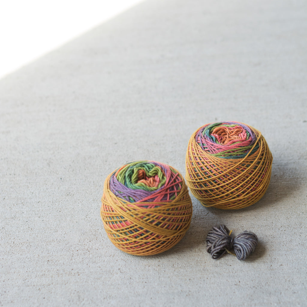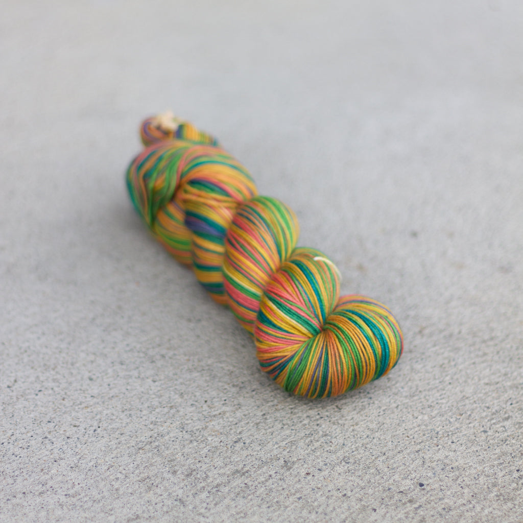 Shawl Yarn Specially dyed for top-down triangular shawls. Each stripe is the same width from beginning to end, with no ends to weave in. 100 g of fingering weight is enough for a small shawlette. 150 g gives a more generous size. If you want to maximize your yardage, choose our 4-Ply sock yarn.