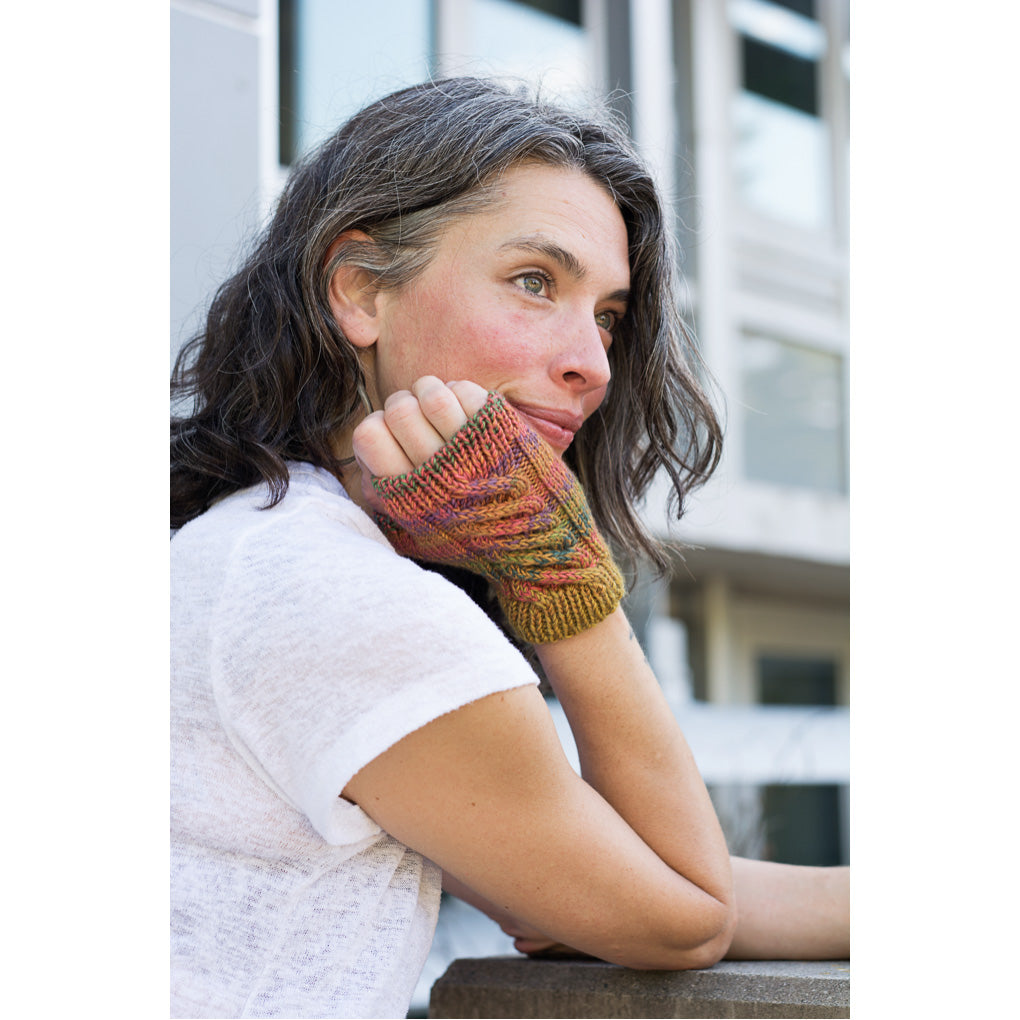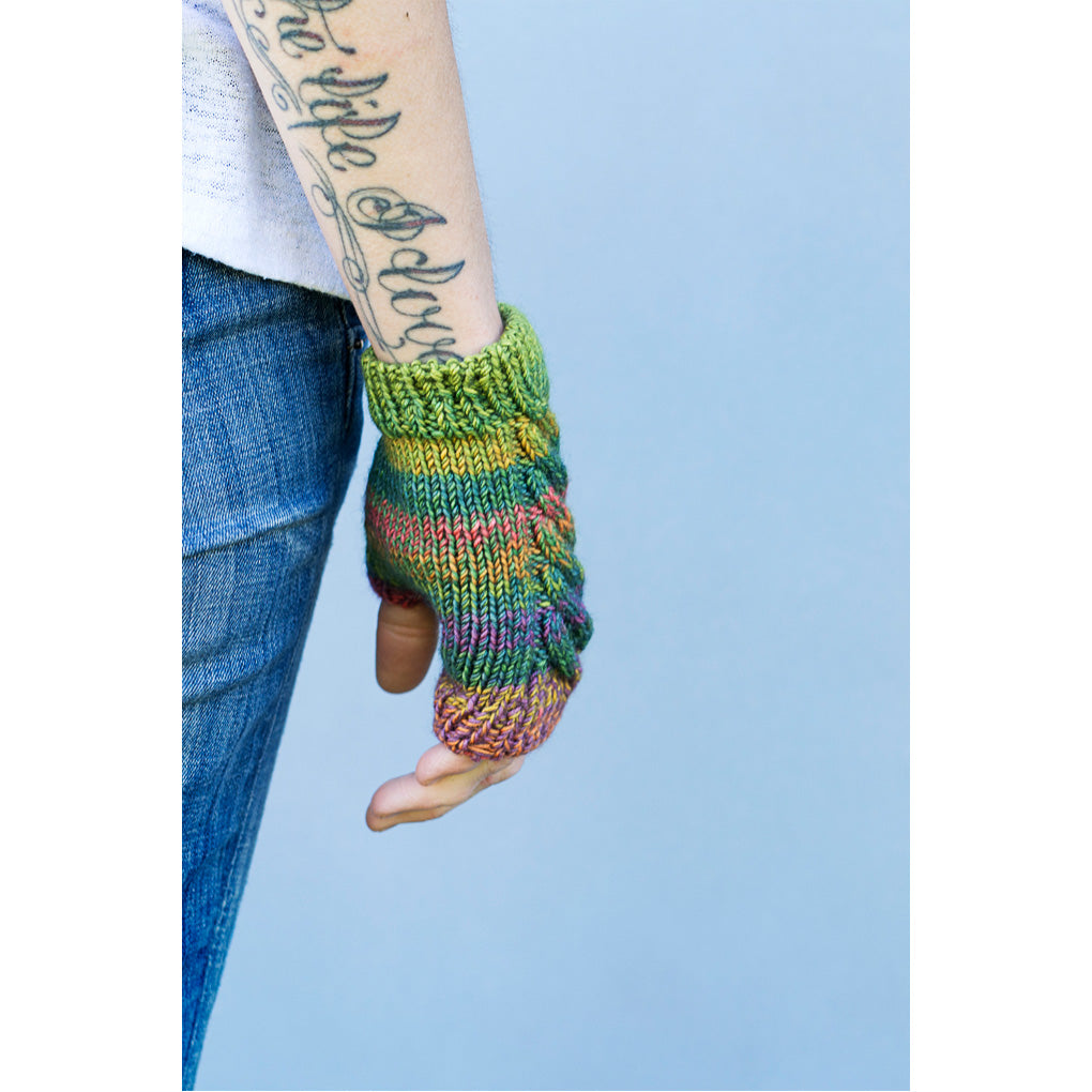 A single 115 g / 4 oz skein of this self-patterning yarn is all you need to make two (!) pairs of these cheerful, marled fingerless mitts.