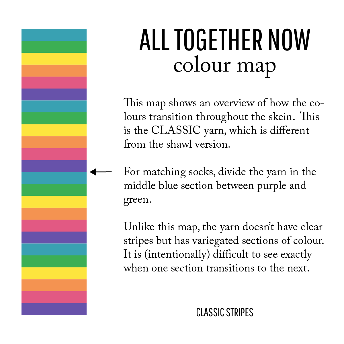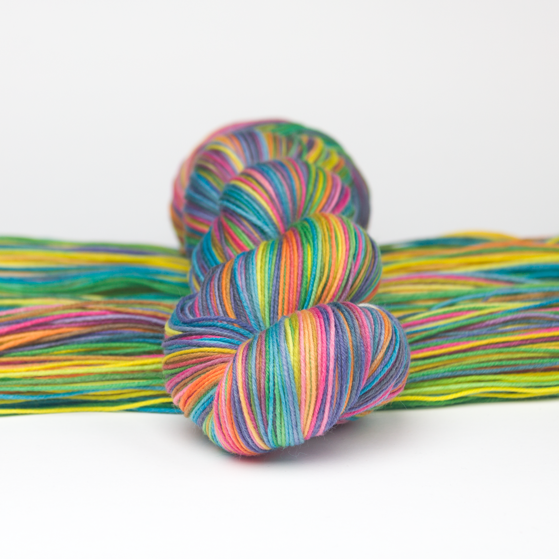 All Together Now is a vibrant self-striping rainbow gradient/fade yarn. Named after the Beatles song All Together Now: "Pink, brown, yellow, orange, blue, I love you"