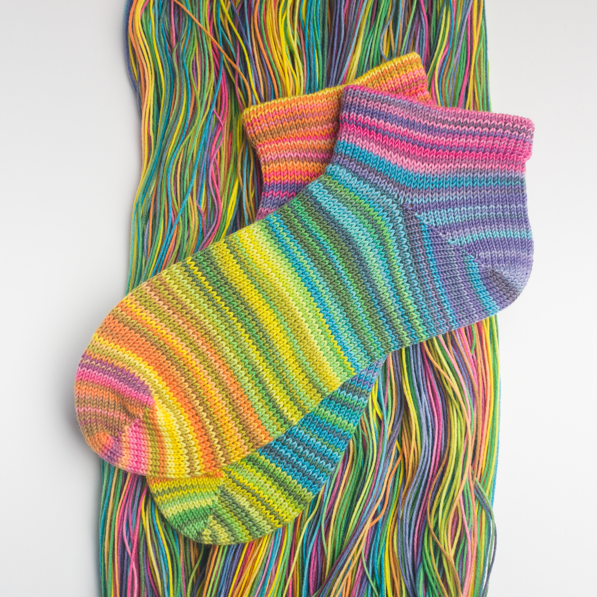 Socks pictured have a folded hems, short row heels, and short row toes. We cast on 60 stitches around and made them long enough to fit a women's size 9. Each sock uses just over 1/4 of a skein.
