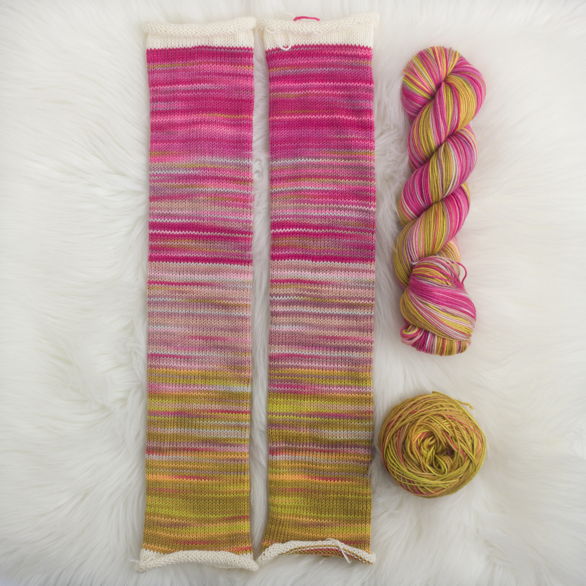 A variegated-fade colourway with two matching halves. One skein will make a pair of socks large socks.