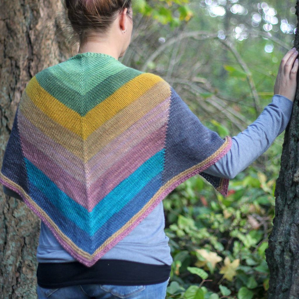 A central chevron in a rainbow of colours is framed with grey wings in this edgy shawl in Cypress. This colourway was developed with designer Andrea Rangel to perfectly coordinate with her North Shore Shawl pattern.