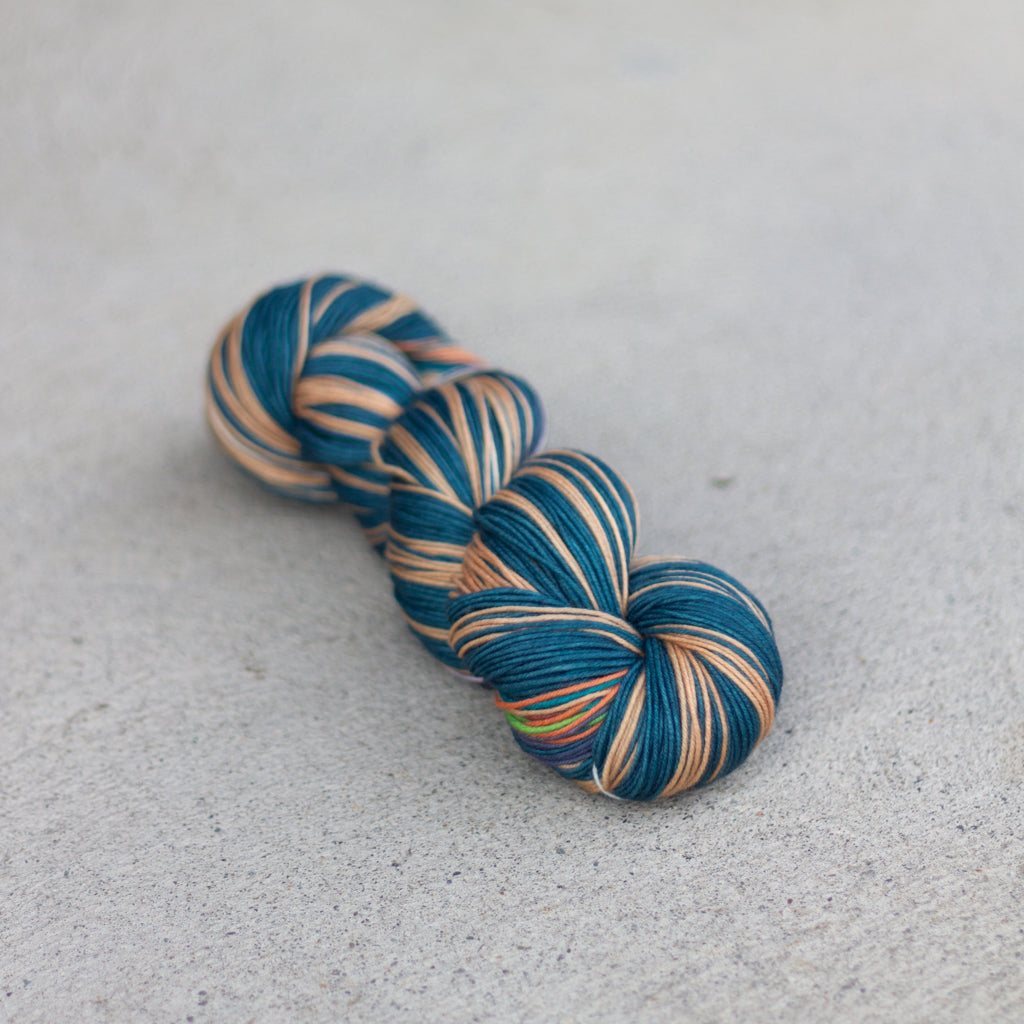 Round Trip "There and back" with two matching halves—perfect for projects like socks. One 100 g skein of fingering weight is enough for an average-size pair of women's socks. For longer or wider socks, choose the 150 g size.