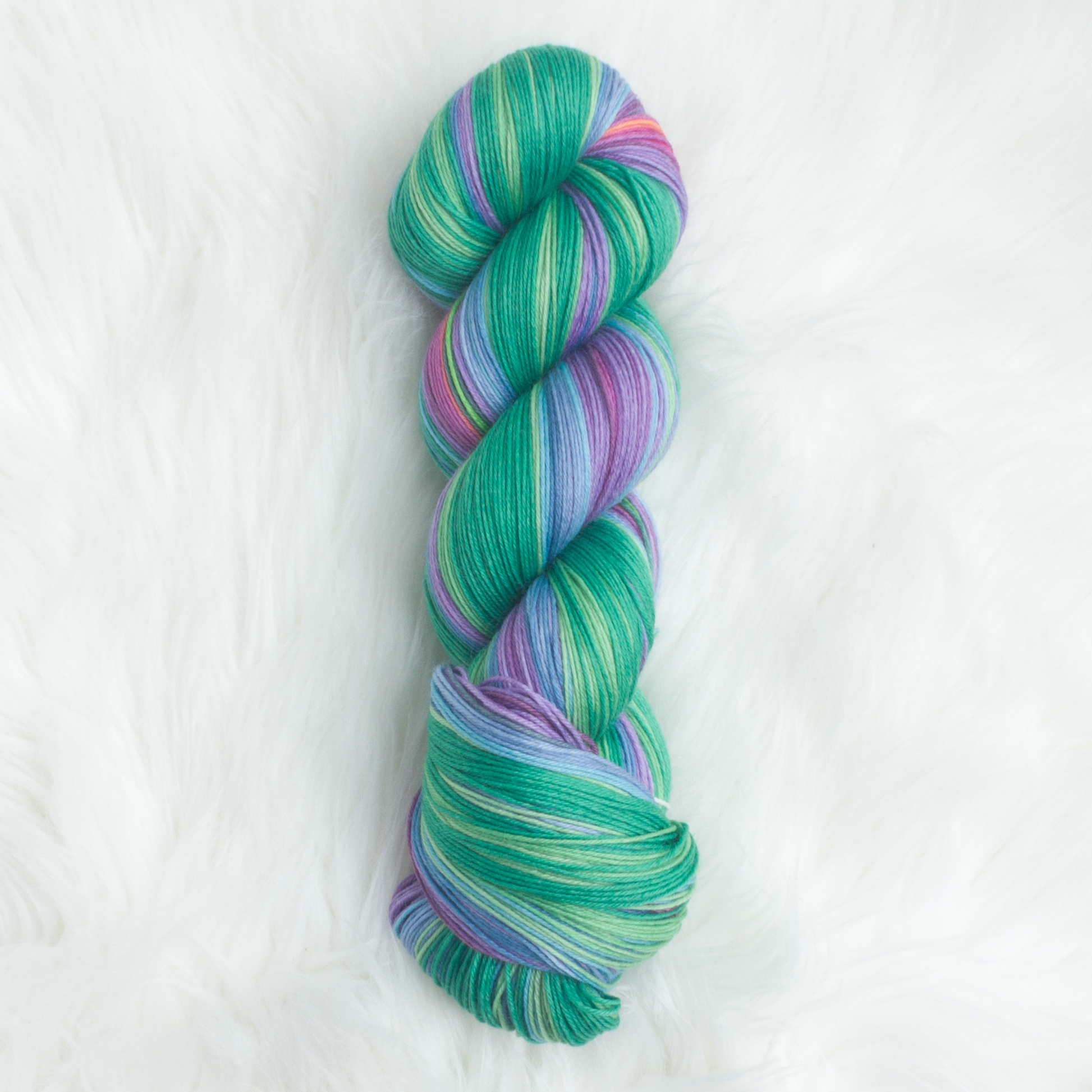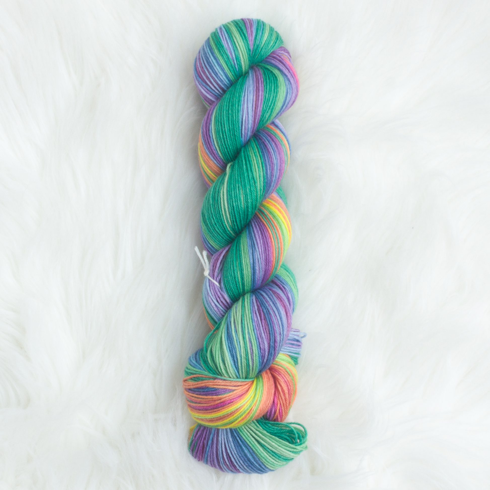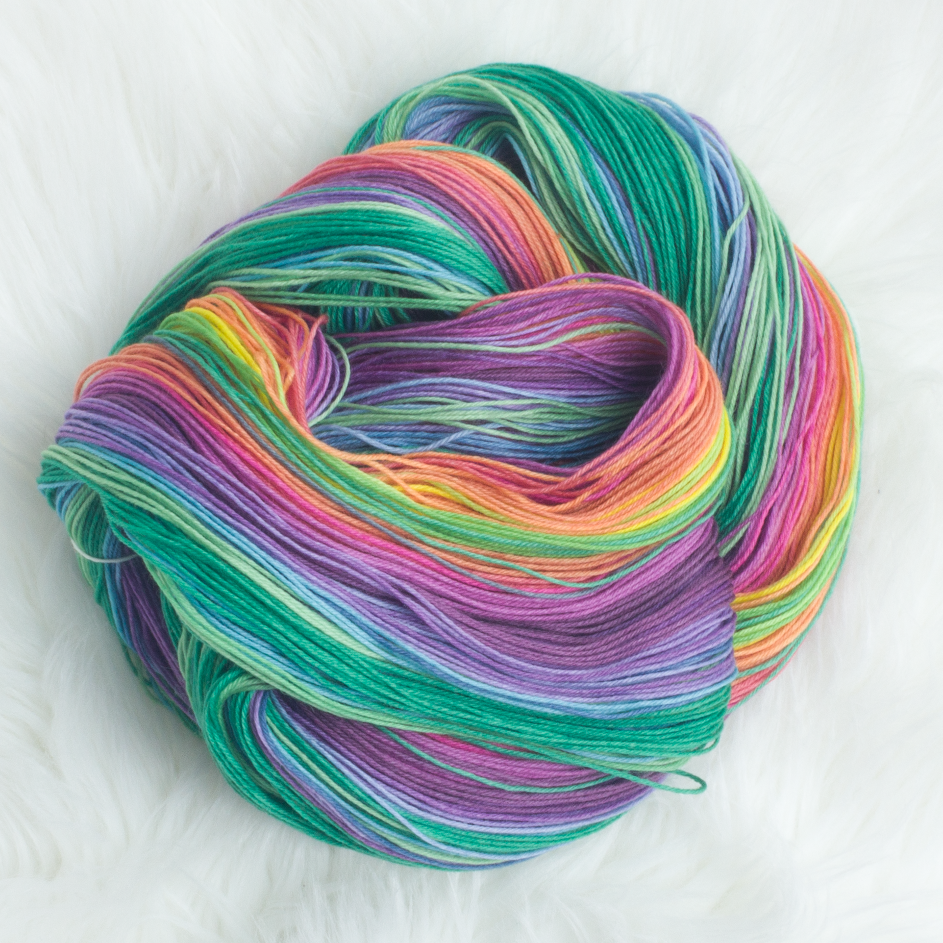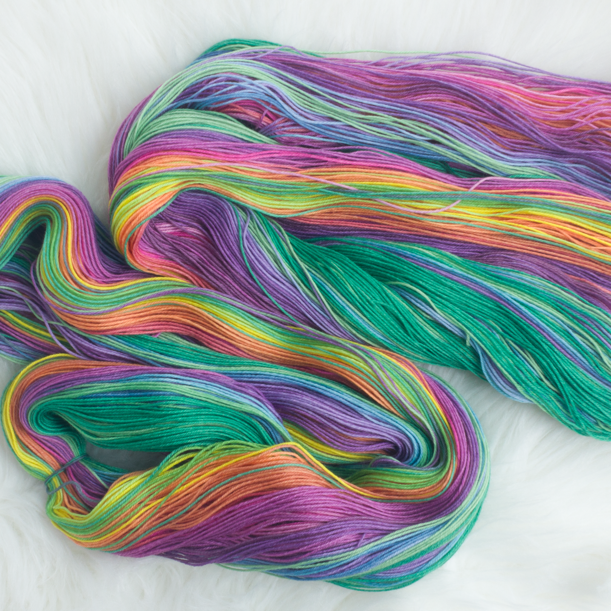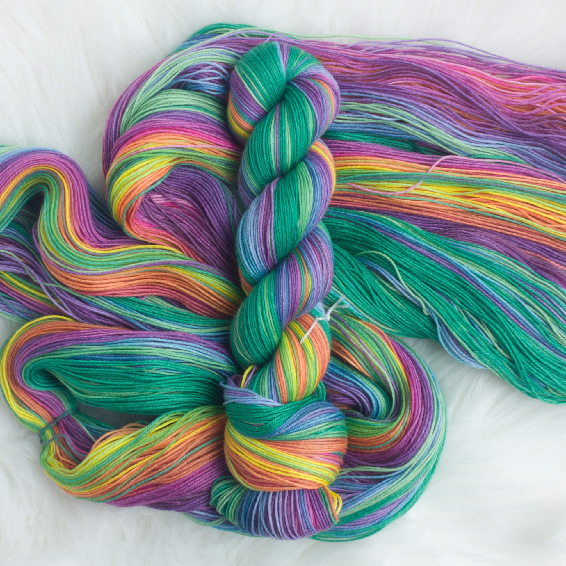 This self-striping rainbow was dyed for hats, cowls, or any other project that requires one long pattern repeat.