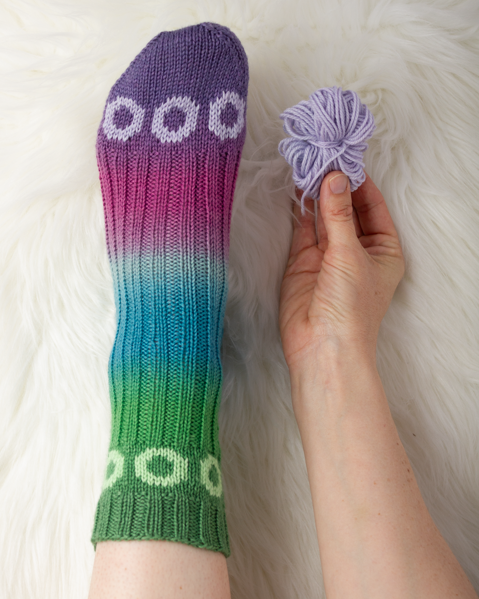 The pattern for the socks in these photos is Wildflower Meadow by Andrea Rangel and is sold separately. The pattern is written for a discontinued yarn but Trifecta can be substituted. For the largest size you may wish to use a 150 g skein to avoid a harrowing game of yarn chicken.