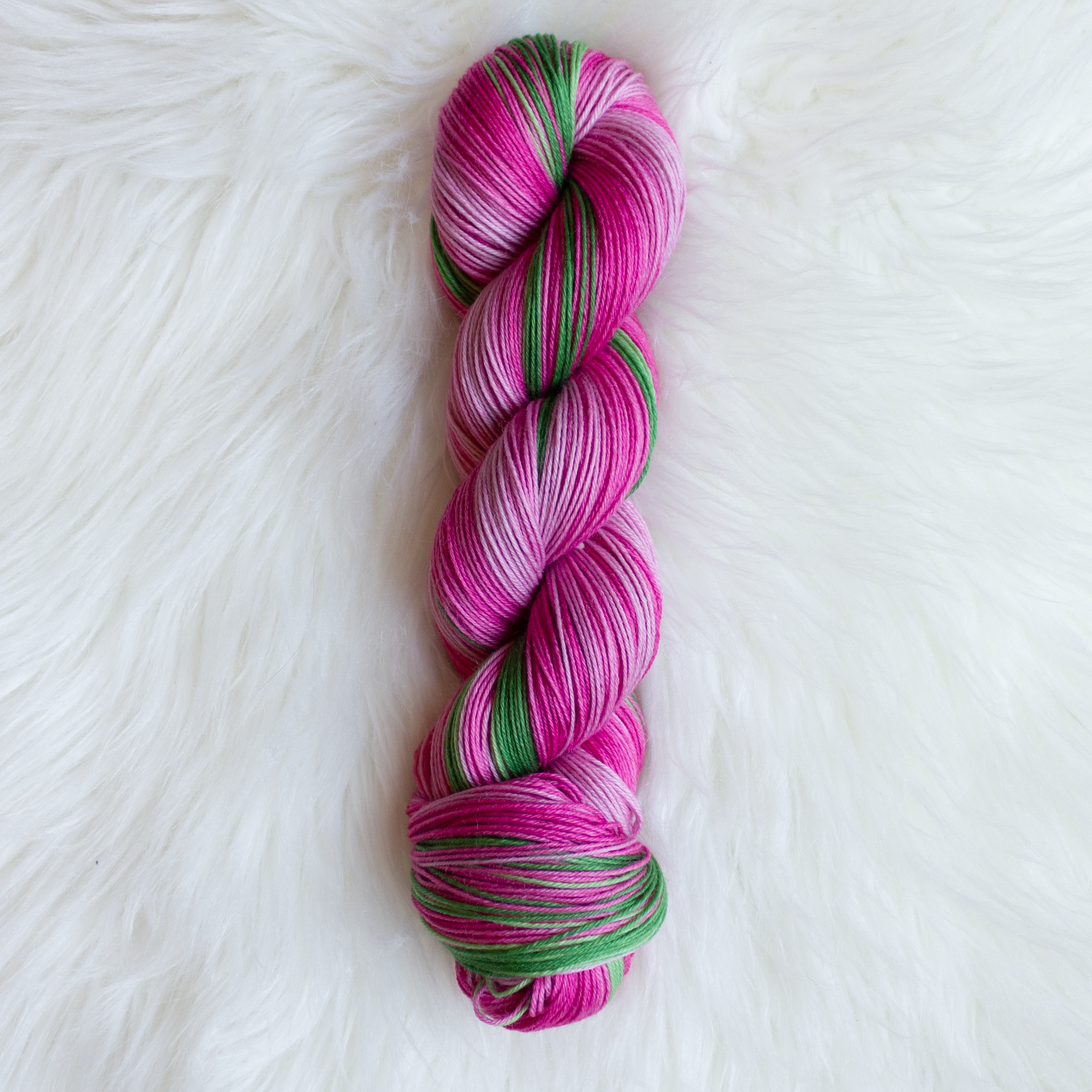 Each skein has all the yarn you need for a matching pair of socks: two long pink gradients and two short sections of green to complete the bouquet. You can divide them into separate balls as you wind.