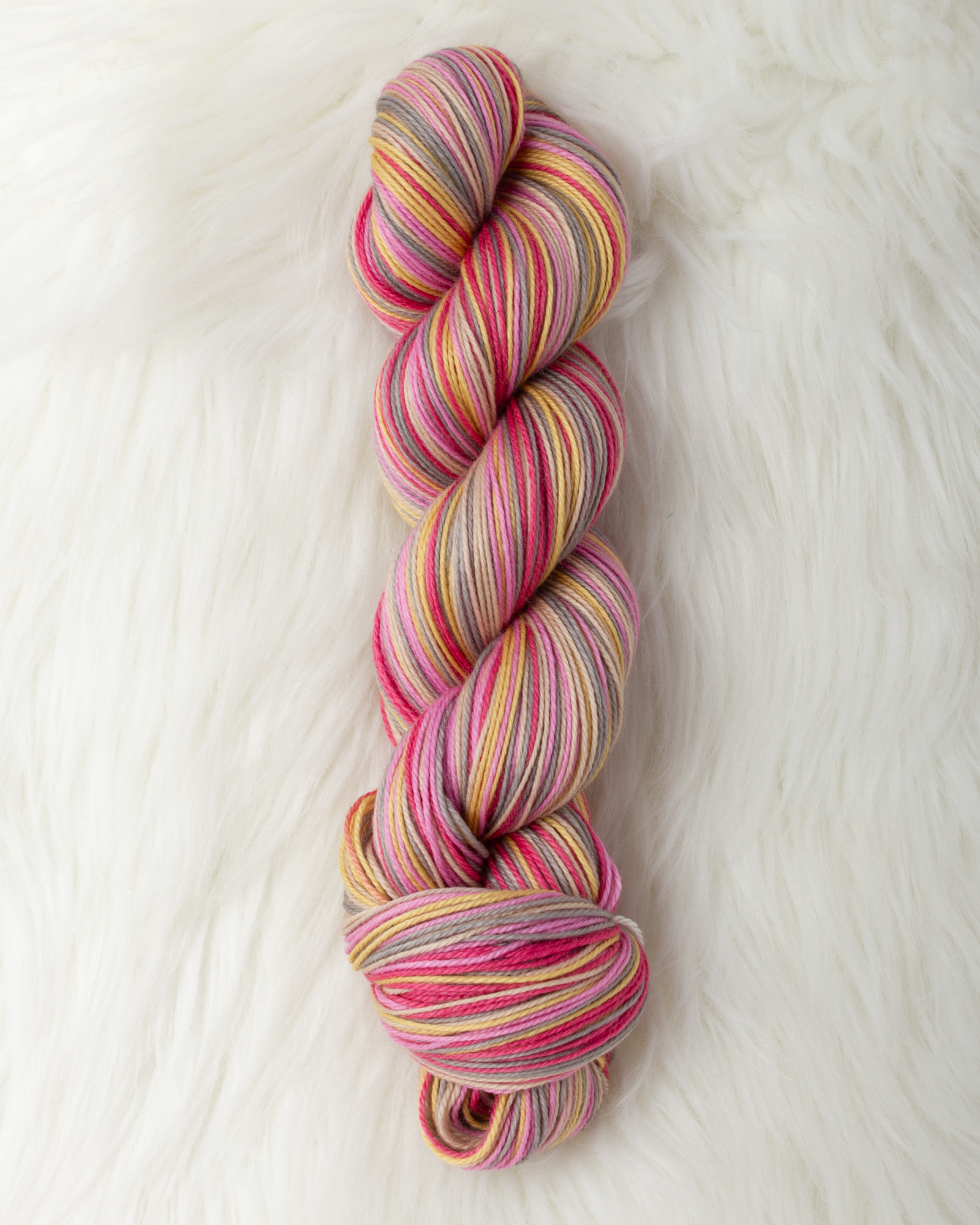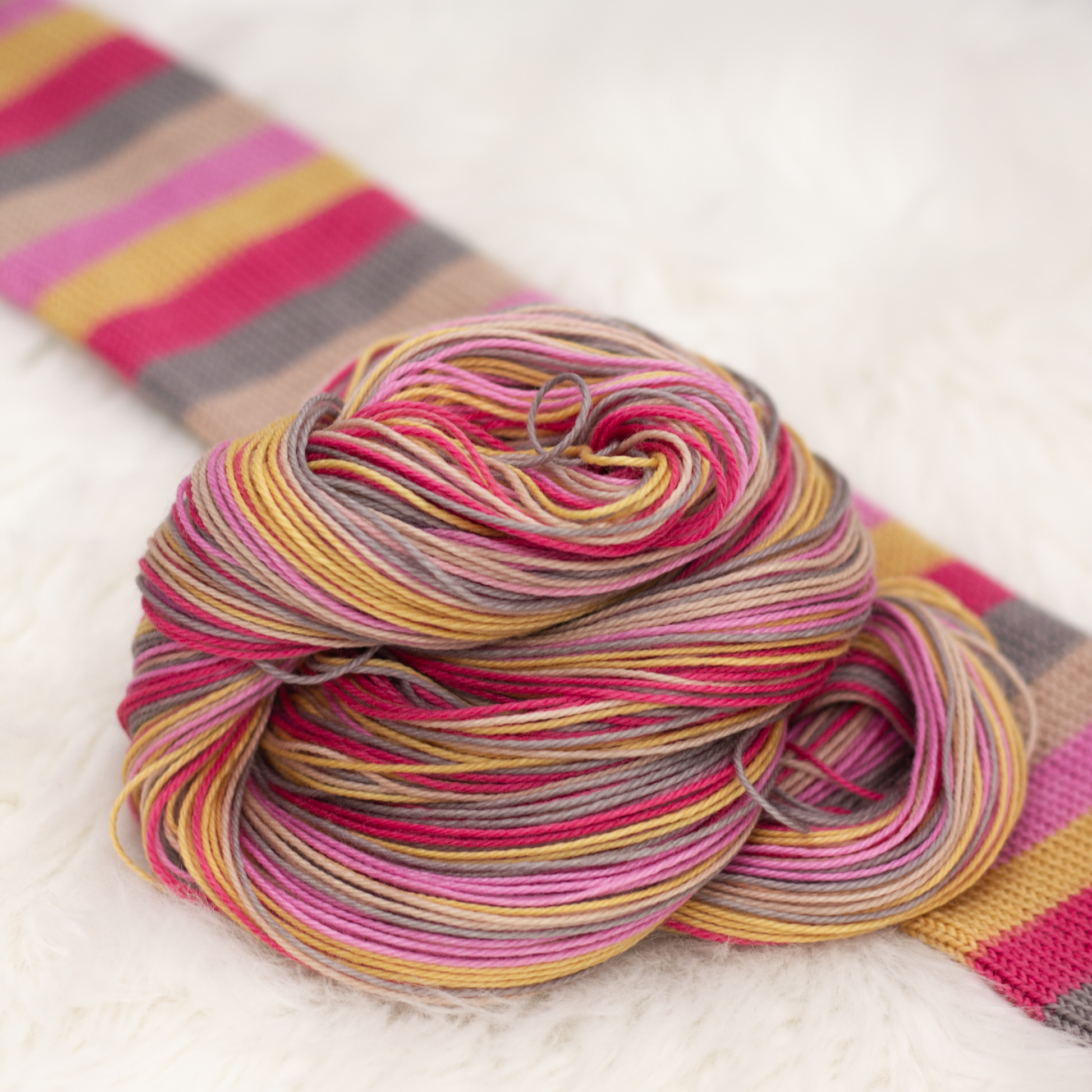 Shawl Yarn Specially dyed for top-down triangular shawls. Each stripe is the same width from beginning to end, with no ends to weave in. 100 g of fingering weight is enough for a small shawlette. 150 g gives a more generous size. If you want to maximize your yardage, choose our 4-Ply sock yarn.