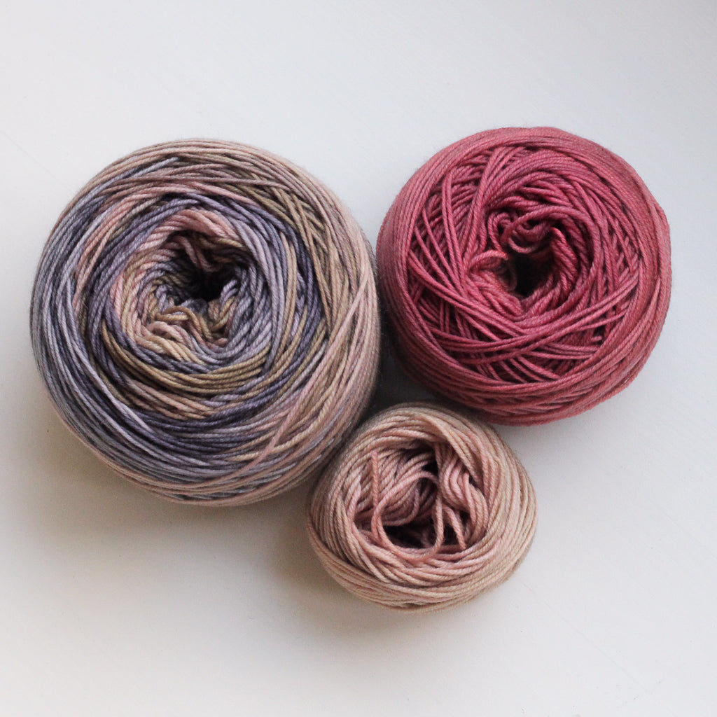 Shawl Yarn Specially dyed for top-down triangular shawls. Each stripe is the same width from beginning to end, with no ends to weave in. 100 g of fingering weight is enough for a small shawlette. 150 g gives a more generous size. If you want to maximize your yardage, choose our 4-Ply sock yarn.