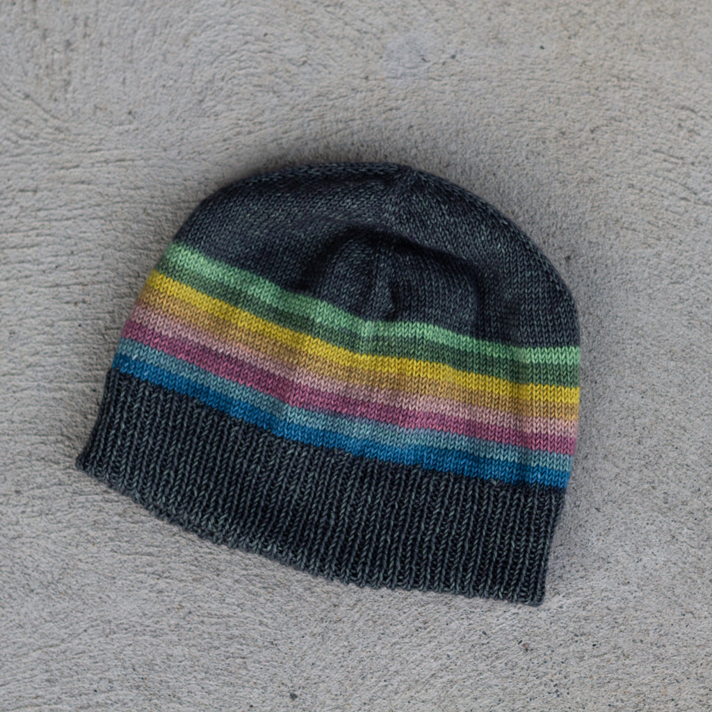 A single 115 g / 4 oz skein of this self-patterning yarn is all you need to make this clever, reversible hat.